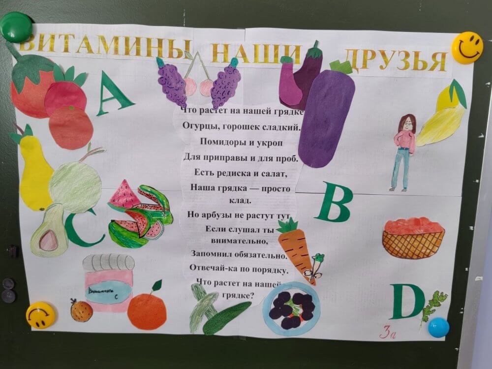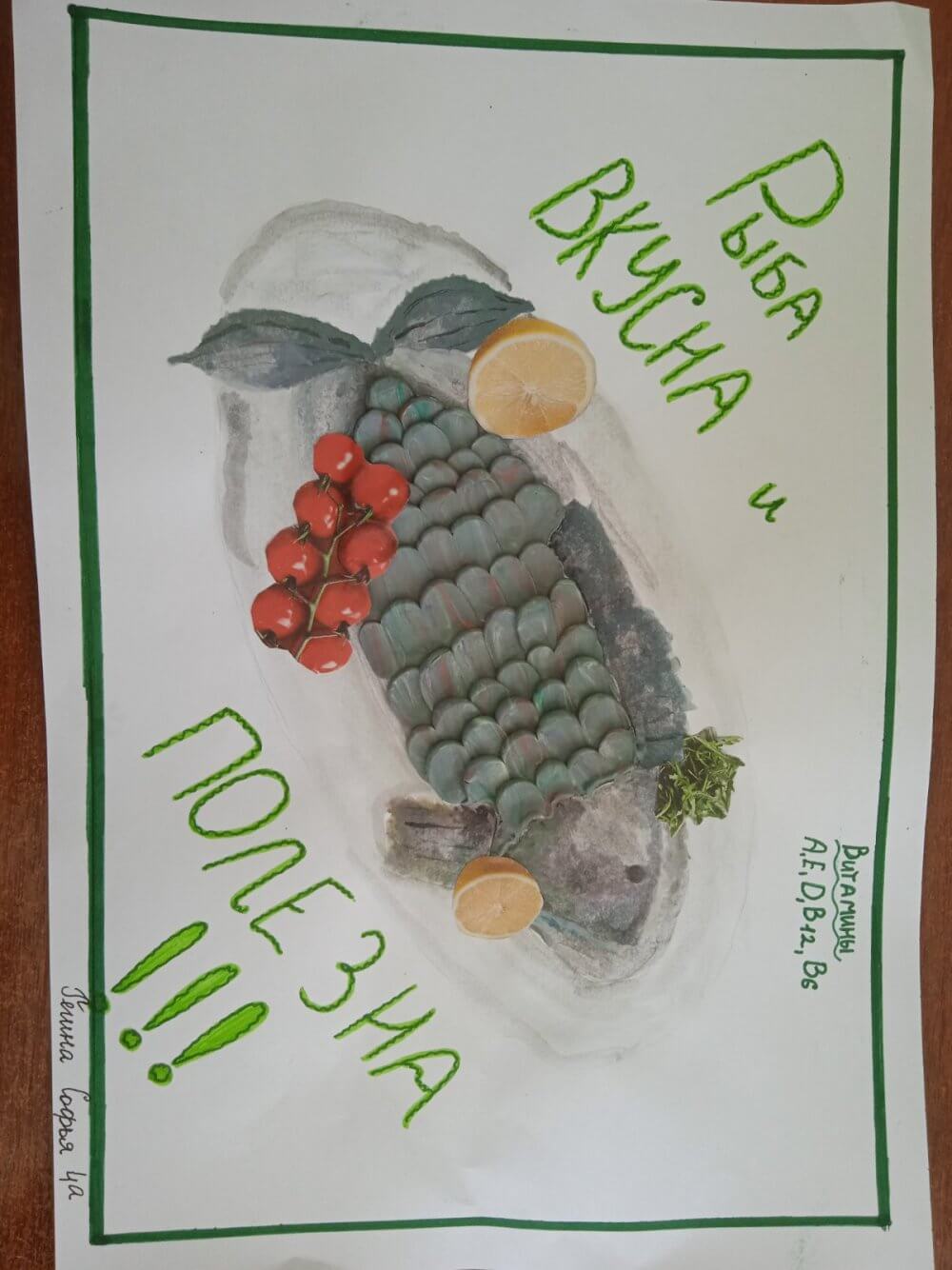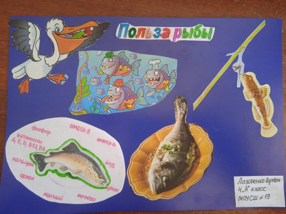 - в 4 классах - коллажи "Польза рыбы", «Полезные продукты», "Еда без вреда", "Овощи и фрукты - богатые витаминами продукты".